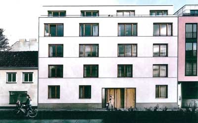 Alle Außenwände bestehen aus einem einschaligen Mauerwerk aus Lochziegeln mit innliegender Mineralwolldämmung. Hierbei wurden die Straßen- und Hoffassaden mit einem 42,5 cm starken und die Gebäudeabschlusswände mit einem 36,0 cm starken Mauerwerk versehen. Alle tragenden Innenwände wurden aus Kalksandsteinmauerwerk mit einer Rohdichte von 2,0 kg/m³ hergestellt.